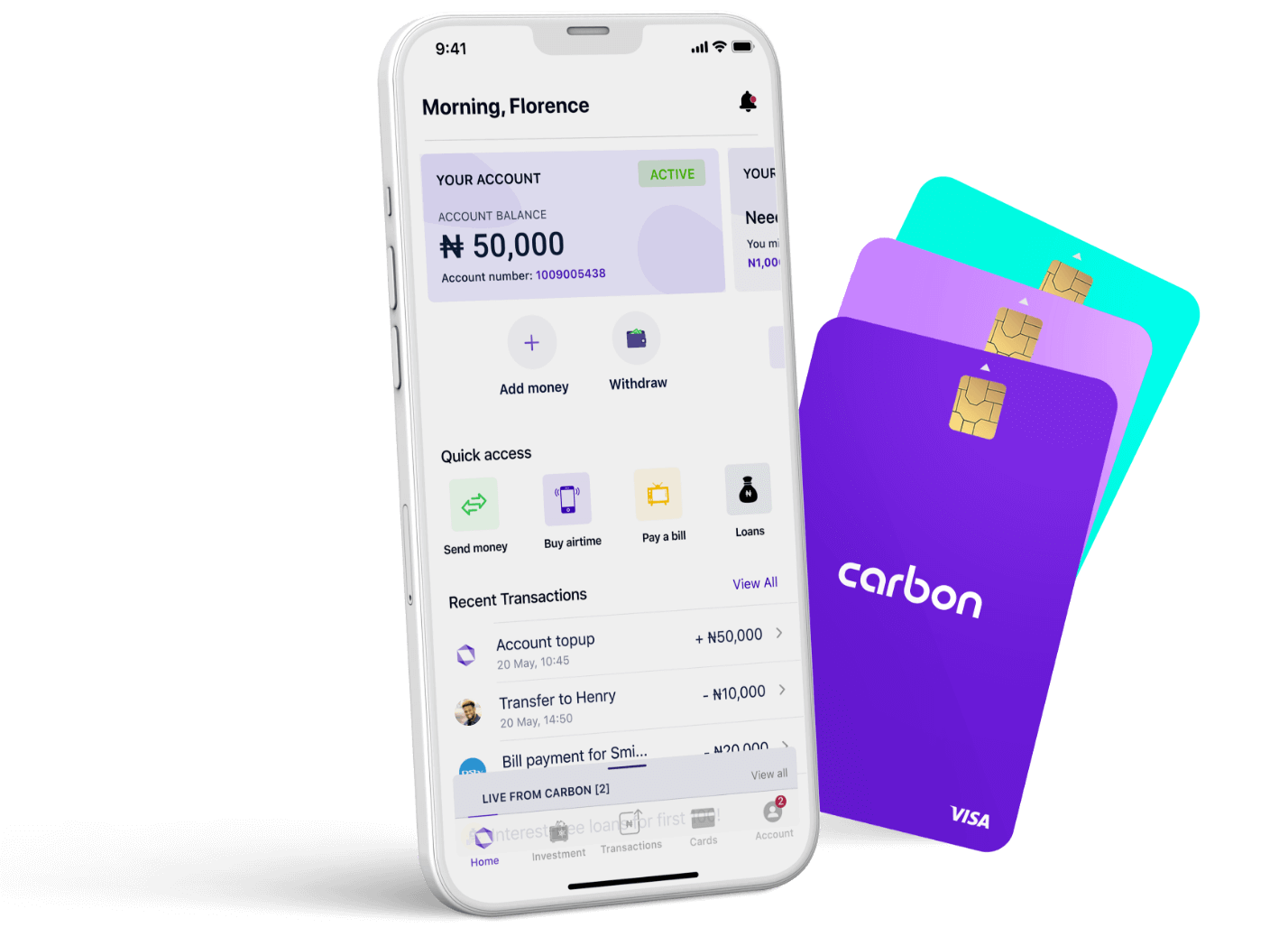 Your Carbon account allows you enjoy cheaper transactions, zero account fees, and an annual interest of 2% per annum.